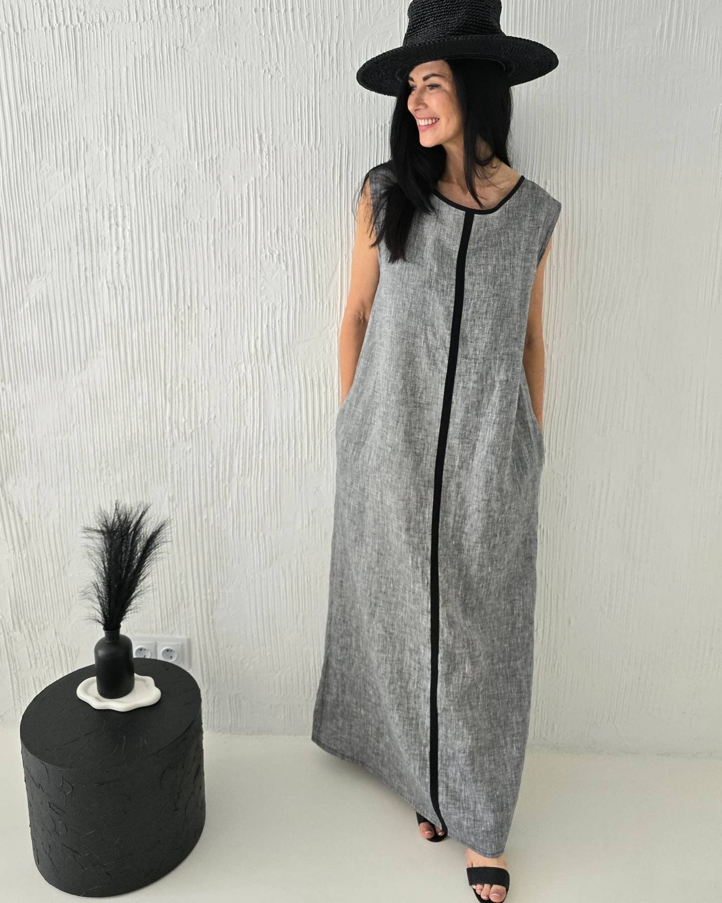 Pelēka, gara lina kleita sievietēm.